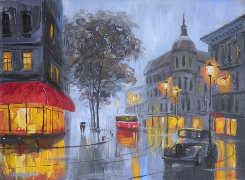 Во французском городе сумерки.Одинокий трамвай. Прохожие по лёгким дождём.