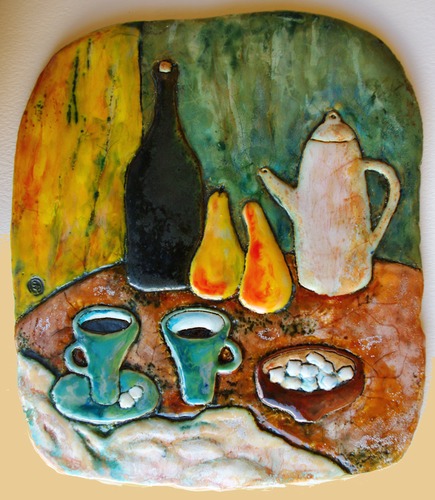 Шамотный пласт, гончарная глина, рельефная лепка, оксиды, грануляты, многослойное глазурное покрытие, 5 обжигов