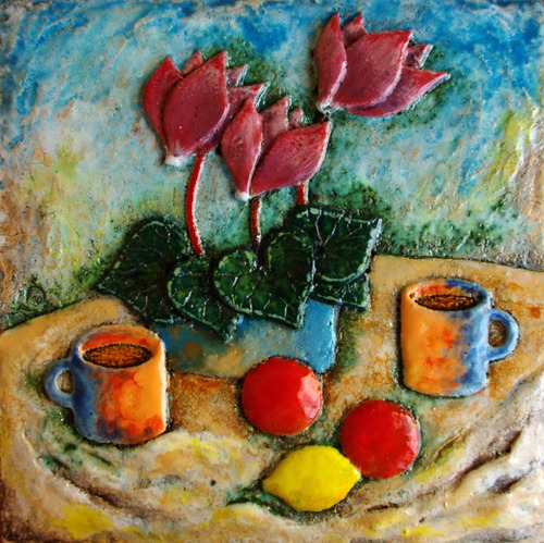 Шамотный пласт, гончарная глина, рельефная лепка, оксиды,эффектарные глазури, многослойное глазурное покрытие, три обжига