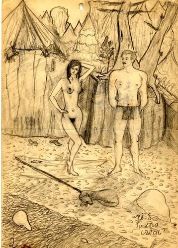 Художник Аси. "С милым и в шалаше рай". Из цикла: "Нелёгкие будни кроманьонцев". 1988 (или 1989). Бумага, карандаш. 29,7X21 см.